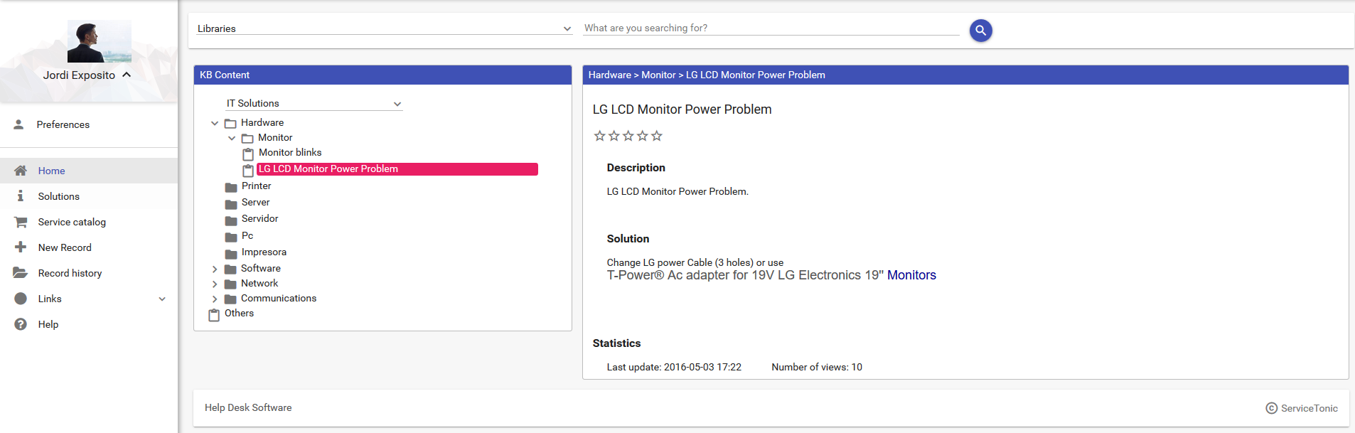 The service can have more than one solutions library, so you can select on the drop-down the library in which you wish to navigate or search for solutions.